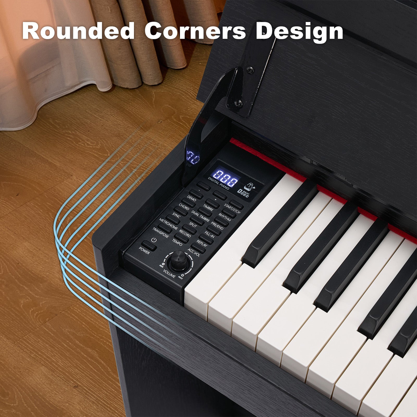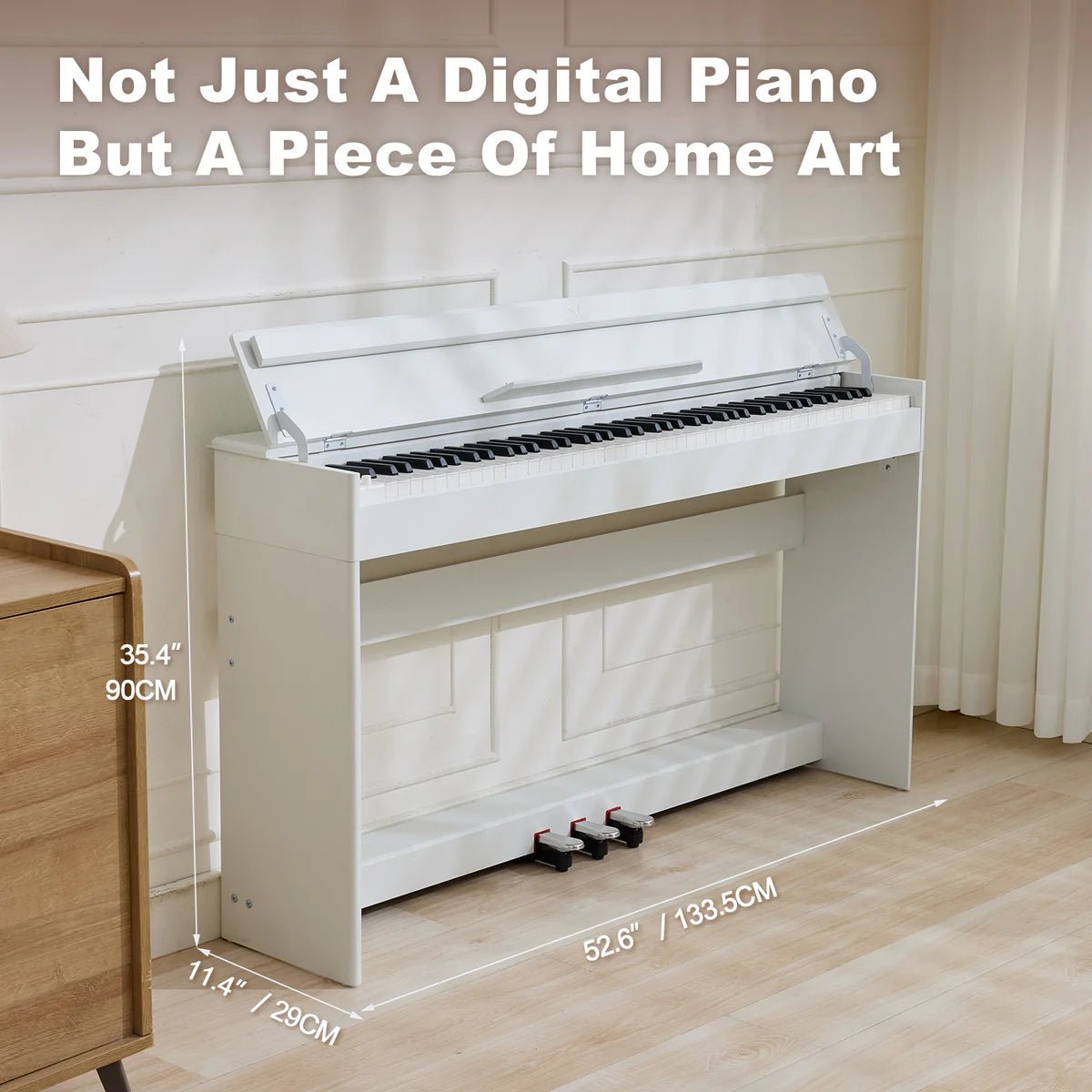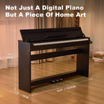 - ♪ Space-Saving Stylish Design- This electric piano 88 is designed specifically for beginners, offering the versatile connectivity options and features tailored for learning. Overall dimension: 29cmD x 133.5cmW x 90cmH . Constructed with FSC wooden material piano body, At just 29cm deep, this sleek electric piano fits snugly in flats or under stairs. The flip-down lid keeps the piano dust-free when not in use, while the furniture-style wooden stand provides a stable, permanent playing surface.