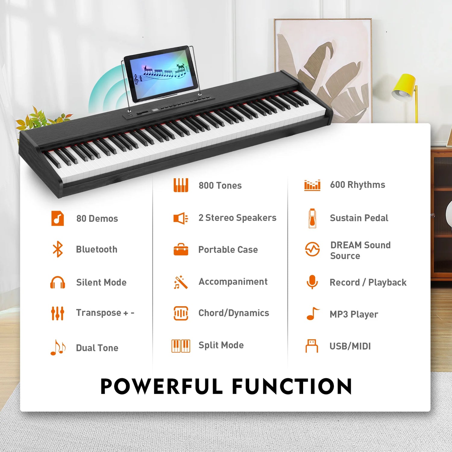 Full size 88 keys Lighted up keys digital piano features with 80demo songs,800 tones, 600 present rhythms, 64 Polyphony and 2 built in stereo speakers, which will give you an expressive and infectious playing time.