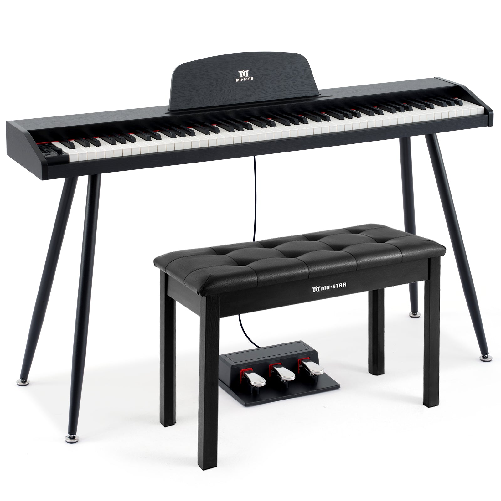to connect smart phone or other devices for more lessons. - ♪ READY TO GO ANYWHERE - Constructed with ABS material piano body, MUSTAR 88 key piano keyboard comes with heavy duty double-X shaped stand for extra stability. Quick-release mechanism allows the player to adjust the stand height, from 17 - 42 in, designed for beginners. Play anywhere, anytime, without taking up space.