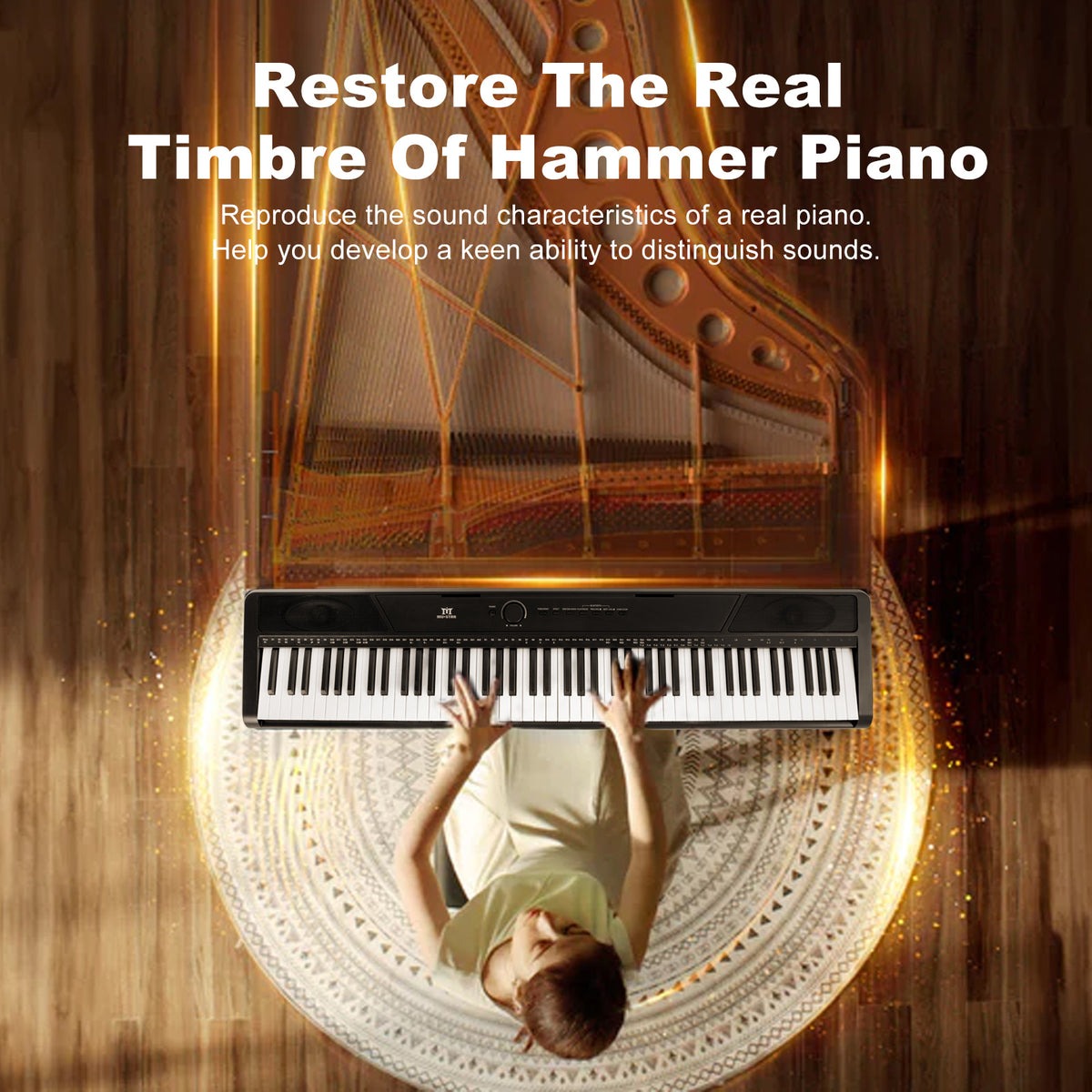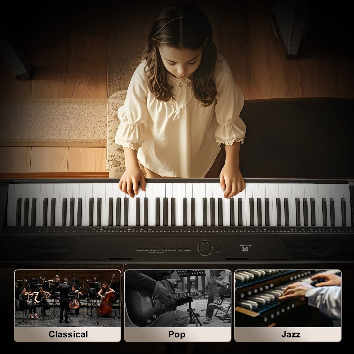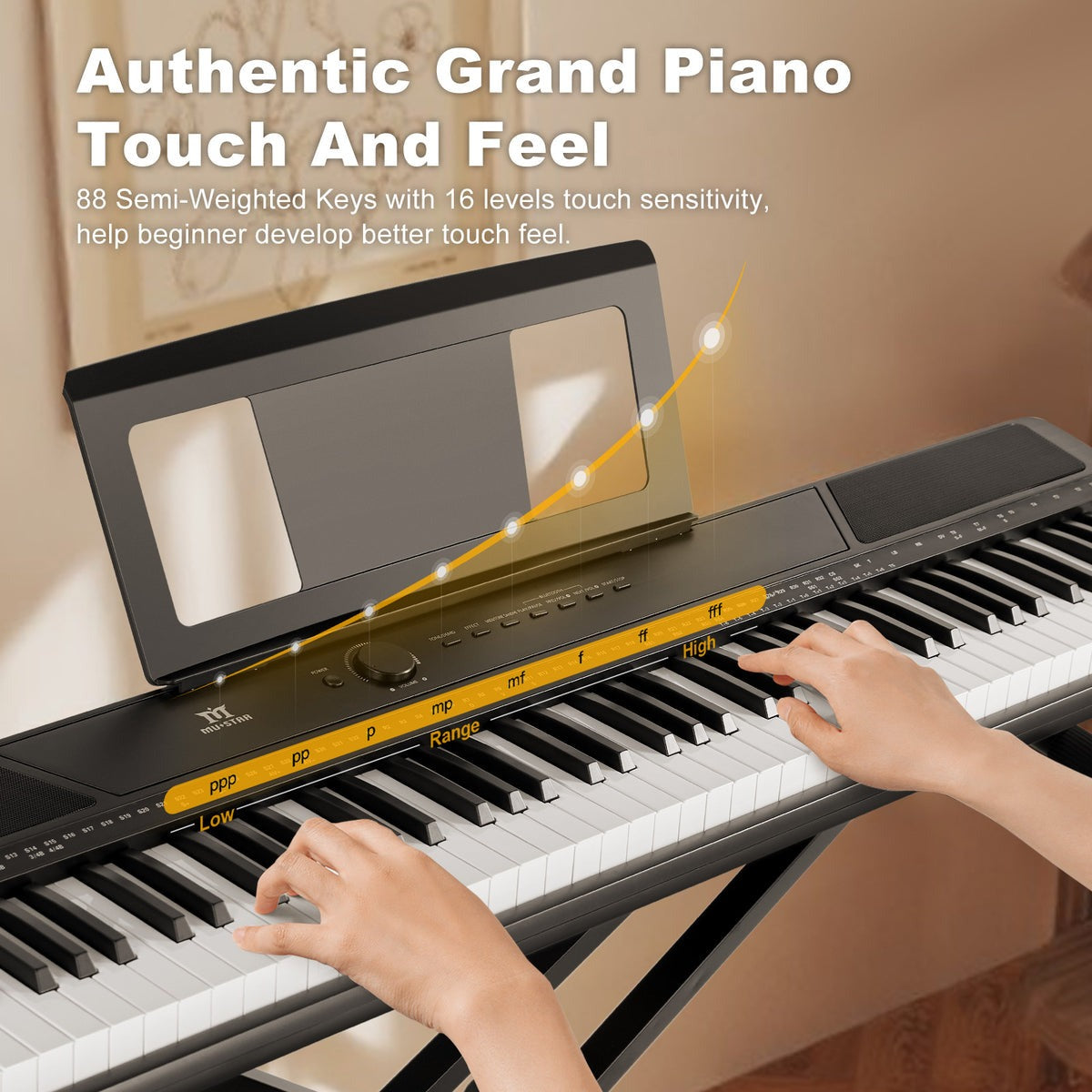MUSTAR digital piano keyboard features with 88 premium full-sized semi weighted keys which could reflect every nuance of your touching. Play heavily to get louder tones or play soft for quieter sounds, providing a quality playing experience.